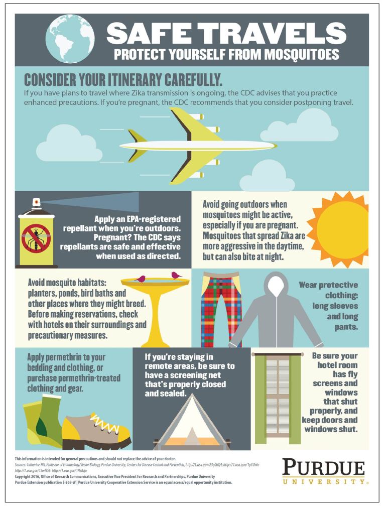 When the Zika virus began making headlines and travelers became concerned about visiting hot spots, we partnered with a Purdue entomologist to develop a tip sheet on ways that people can protect themselves from mosquito bites. The infographic is available for download from the Purdue Extension Education Store.