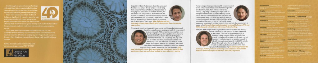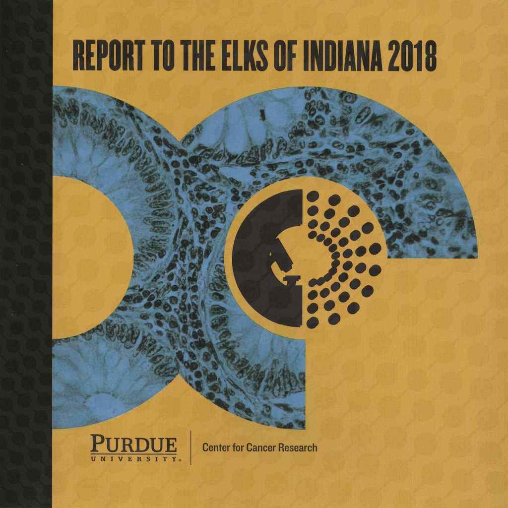 The Purdue Center for Cancer Research receives funding each year from the Elks of Indiana, a philanthropic organization that funds high-risk, high-reward research. As part of the Elks’ annual conference, we created a brochure highlighting funded research projects from the previous year. The cover design features backward and forward capital Cs (representing the words “Cancer Center”), with a duotone image of cancer cells. The dot pattern, which was a varnish applied during printing, is a stylized representation of molecules.
