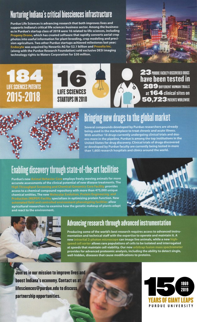 In Indiana, the Purdue University Life Sciences Initiative plays a critical role in growing the biosciences economy. Companies can contract with Purdue to access advanced instrumentation and technical expertise that the companies don’t have onsite. This brochure was geared toward prospective corporate clients. We highlighted the university’s accomplishments in commercialization and spotlighted some of the available facilities.